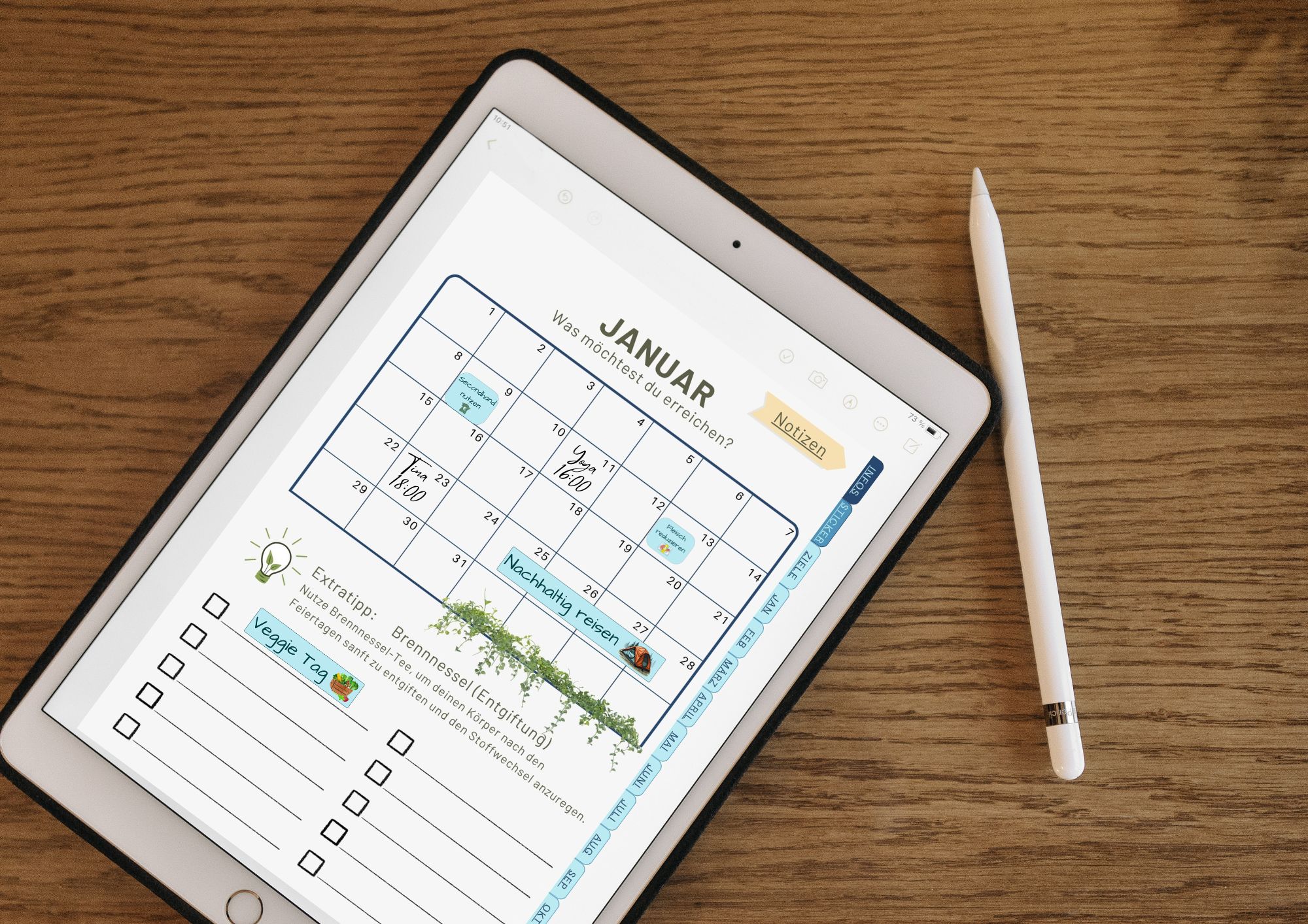 Der digitale Planer soll dir dabei helfen, deinen ökologischen Fußabdruck zu reduzieren. Behalte deine Ziele immer im Blick. Wichtige Tipps zum nachhaltigen Handeln. Im Extratipp gibt es jeden Monat eine nützliche Pflanze aus Mutter Natur Apotheke.